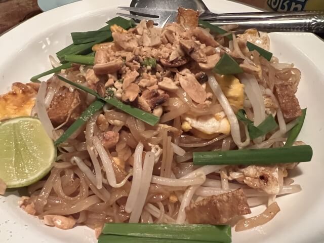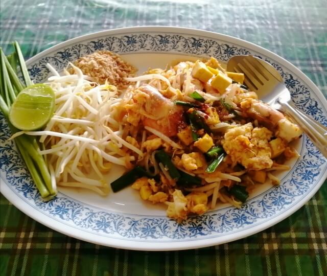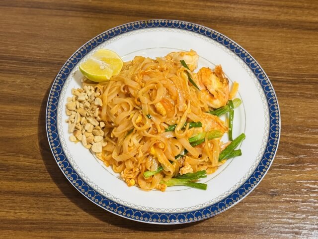 전통적으로는 쌀국수(파이타이)와 다양한 재료를 볶아 만든 요리로, 보통 새우, 닭고기, 두부, 계란 등이 들어갑니다.